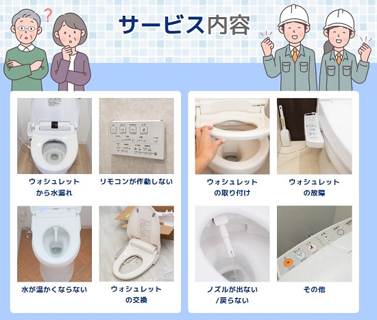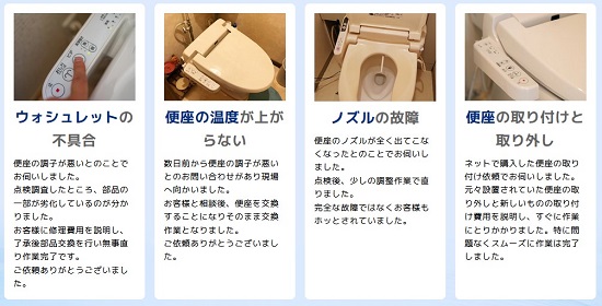 土浦市で対応可能な温水便座、ウォシュレットの修理サービスとなります。その他のトラブルやご相談に関しましてはお気軽に受付窓口までお問い合わせください。